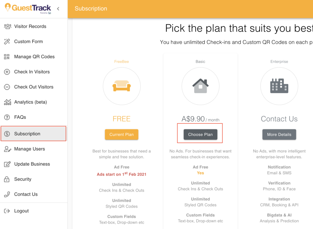 GuestTrack Subscription Options