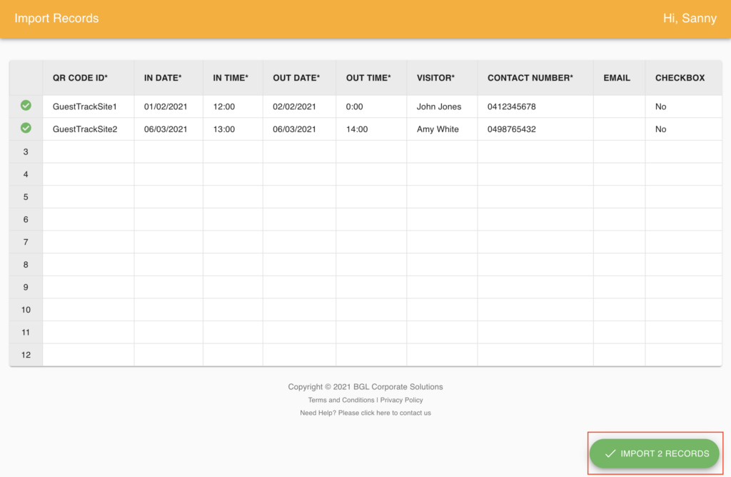 Click the Import Records button. The imported records can be viewed in the Visitor Record section.