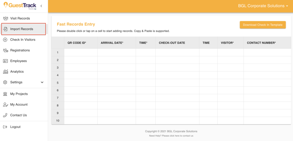 Import visitor records from other sources into GuestTrack using the bulk Import Records function — with Excel-like copy/paste and automatic data validation.