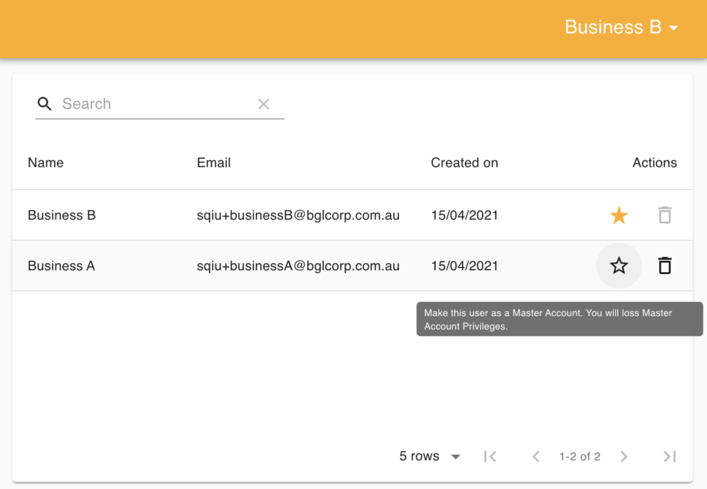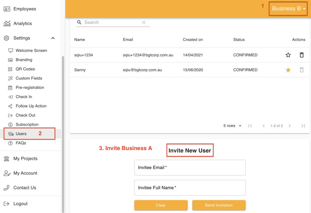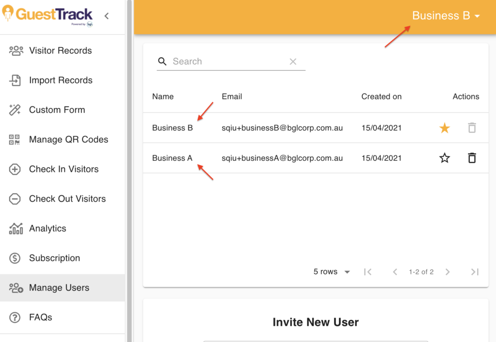 For example currently you have two businesses with GuestTrack, Business A and Business B, with different email logins, and you wish to be able to manage both businesses under Business A's email login.