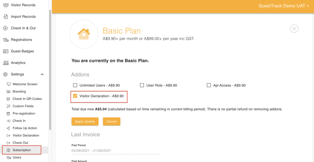 This feature is an add-on feature to the Basic Subscription. Purchase the add-on via Settings > Subscription. Select Visitor Declaration.