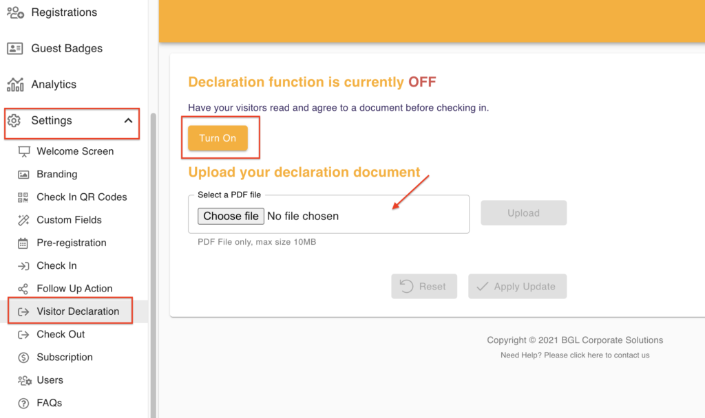 Navigate to Settings > Visitor Declaration. Turn on the function and upload document in PDF format.