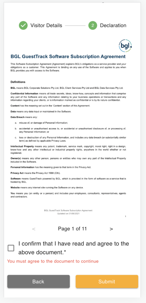The visitor declaration function allows you to have your guests read and agree to a document before checking in. The document could be the terms and conditions of your organisation, safety manual etc.